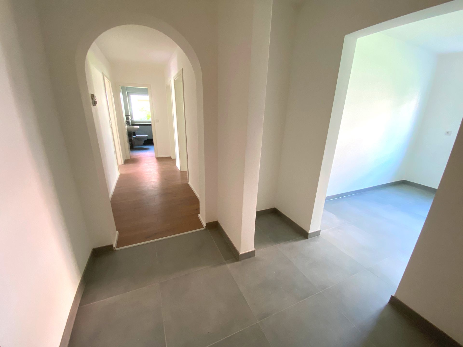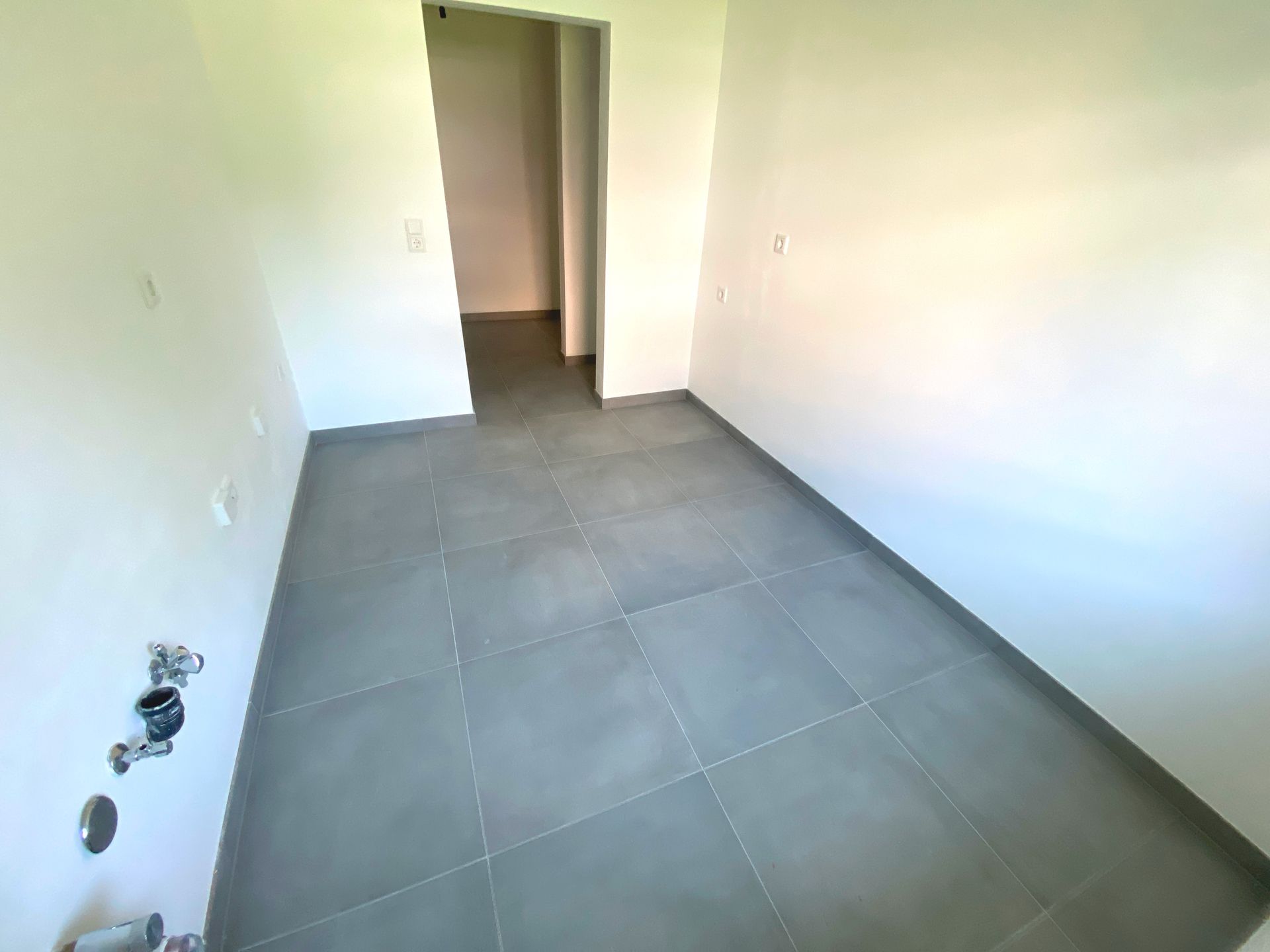 - Neue 60 cm x 60 cm Fliesen in Bad, Küche und Eingangsbereich in Grau