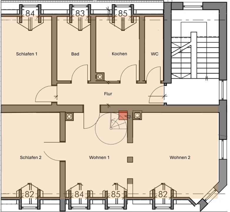 Die Wohnung misst eine Wohnfläche von 81,21 m² + 31,45 m² Nutzfläche (Bodenfläche) im 2. Geschoss der Wohnung.